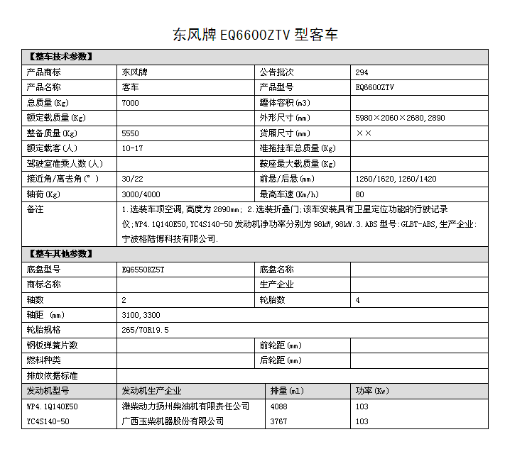 EQ6600ZTV四驅(qū)越野客車圖片,國五排放四驅(qū)10座越野客車價格,6米四驅(qū)客車多少錢,東風(fēng)四驅(qū)越野客車參數(shù)配置: 1.底盤型號EQ6550KZ5T,發(fā)動機(jī)型號:YC4S140 50 國五排放 2.整車外形尺寸長寬高:(5980×2060×2890)mm 驅(qū)動形式:4×4 東風(fēng)分時四驅(qū) 3.離合助力,方向助力,斷氣剎,鼓式自動,駕駛區(qū)域空調(diào) 4.車橋為東風(fēng)德納,輪胎為265/70R19.5型越野輪胎,ABS 5.工具箱,前置防裝杠,粘接式推拉玻璃,發(fā)動機(jī)底板防護(hù) 6.鋁花紋地板,中檔皮革座椅10個+1個折疊座椅,整車座椅安全帶,手動式外擺門,正副司機(jī)門,后置雙開門,東風(fēng)原廠派恩頂置空調(diào) , 7.窗簾,滅火器兩個,備胎一個,獨立燃油暖風(fēng)系統(tǒng)帶兩個雙面王出風(fēng)口 8.其它為EQ6600ZTV型四驅(qū)越野客車標(biāo)配。具體配置參數(shù)參照(附件一)。 成品合格證、全額上戶發(fā)票、隨車工具、隨車文件各一套。