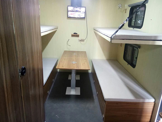 3、休息區(qū)備有4個(gè)上下鋪,配有床墊,每個(gè)上下床鋪依靠的墻壁上都有一個(gè)風(fēng)景透氣窗。每個(gè)床鋪下面設(shè)一組附件柜,床位兩側(cè)上方各配衣帽鉤、插座和可調(diào)節(jié)床頭燈,休息區(qū)配有19寸液晶電視一臺(tái)及空調(diào)一部。