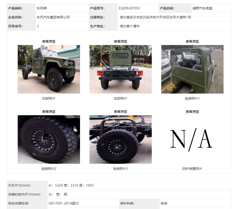 東風(fēng)猛士民用版EQ2063EYY6J型四驅(qū)越野汽車(chē)底盤(pán)在340批次公告中公示成功!