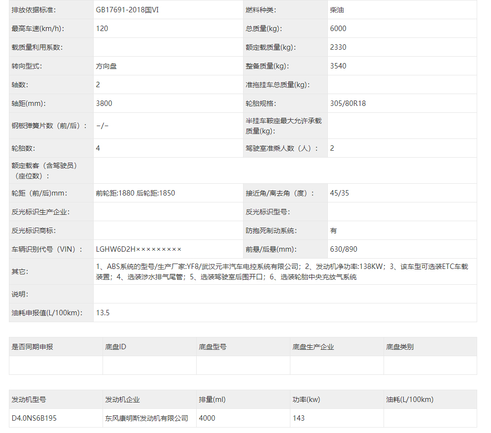 東風(fēng)猛士民用版EQ2063EYY6J型長(zhǎng)頭單排四驅(qū)越野底盤(pán)其它參數(shù):1、ABS系統(tǒng)的型號(hào)/生產(chǎn)廠家:YF8/武漢元豐汽車(chē)電控系統(tǒng)有限公司;2、發(fā)動(dòng)機(jī)凈功率:138KW;3、該車(chē)型可選裝ETC車(chē)載裝置;4、選裝涉水排氣尾管;5、選裝駕駛室后圍開(kāi)口;6、選裝輪胎中央充放氣系統(tǒng);7、排放依據(jù)標(biāo)準(zhǔn):GB17691-2018國(guó)Ⅵ。