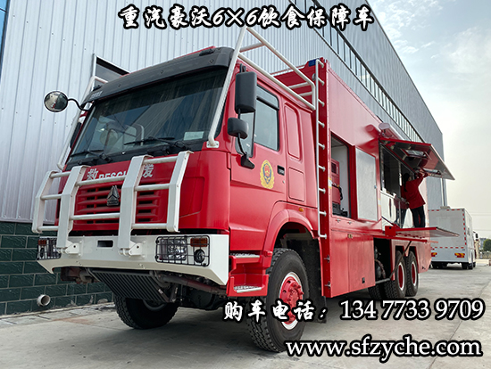 重汽豪沃6×6消防飲食保障車是根據(jù)公安,武警,消防,林業(yè)局,地質(zhì)勘探,水利水電,公路搶險等部門野外執(zhí)行任務的需要,為提高后勤保障能力,改善野外生存條件而研制的一種新型野外自行式炊事車,特別適應快速反應部隊執(zhí)行任務的需要。該車采用重汽豪沃六驅(qū)底盤,車廂為隔熱保溫大板粘接式輕型結(jié)構(gòu),多種供電方式為車內(nèi)各用電設備提供電源。車內(nèi)配有高效的封閉式燃油節(jié)能爐灶、配套設備、各種廚具等。本車具有操作方便、使用可靠、熱效率高,保溫效果好等特點,適應全天候展收作業(yè),是先進的后勤裝備?稍谝恍r內(nèi)供應150人的主副食及開水。備注:據(jù)用戶需求,整車對底盤進行改裝,設有8-13Kw駐車自發(fā)電系統(tǒng),1.5Kw行車發(fā)電系統(tǒng),以及配電系統(tǒng),主副食控制系統(tǒng),作業(yè)監(jiān)控系統(tǒng),水路系統(tǒng),油路系統(tǒng), 附件及工具。