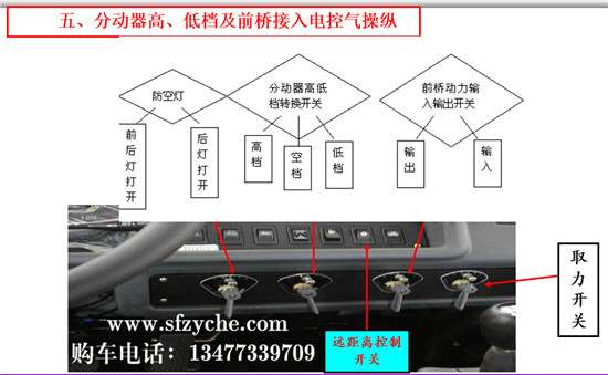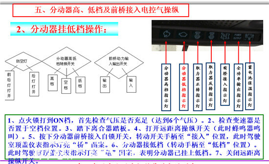 1、點火鎖打到ON檔,首先檢查氣壓是否充足(達到6個氣壓)。2、檢查變速器是否置于空檔位置。3、踏下離合器踏板。4、打開遠距離操縱開關(guān)(此時蜂鳴器鳴叫)。5、按下分動器前橋接入自鎖開關(guān),轉(zhuǎn)動開關(guān)手柄至“接入”位置,此時駕駛室頂蓋儀表指示燈亮“橋”圖案。6、分動器接低檔(轉(zhuǎn)動手柄至“低檔”位置)。此時駕駛室頂蓋儀表指示燈亮“龜”圖案,表明分動器已掛上低檔。7、關(guān)閉遠距離操縱開關(guān)。